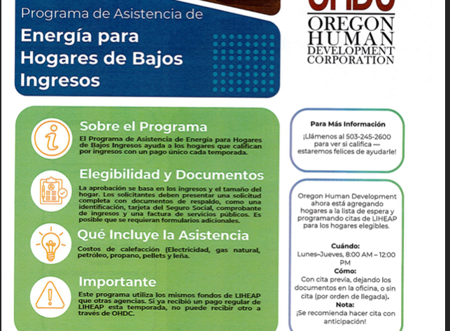 Nuevos programas de asistencia para el pago de energía, denominados Programa de Energía para Hogares de Bajos Ingresos (LIHEAP) y Programa de Asistencia Energética de Oregón (OEAP).