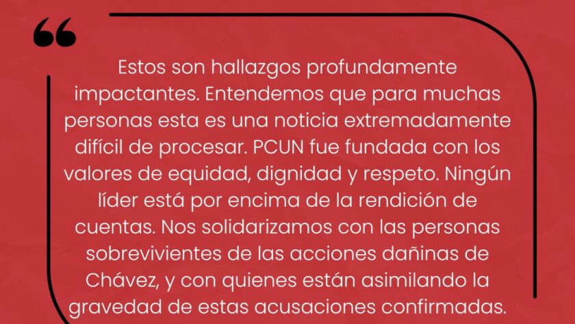 Entendemos que, para muchos, esta es una noticia extremadamente difícil de asimilar. PCUN fue fundado sobre los valores de equidad, dignidad y respeto. Ningún líder está por encima de la rendición de cuentas. Nos solidarizamos con las sobrevivientes de las acciones nocivas de Chávez, así como con aquellas personas que están lidiando con la gravedad de estas acusaciones confirmadas.